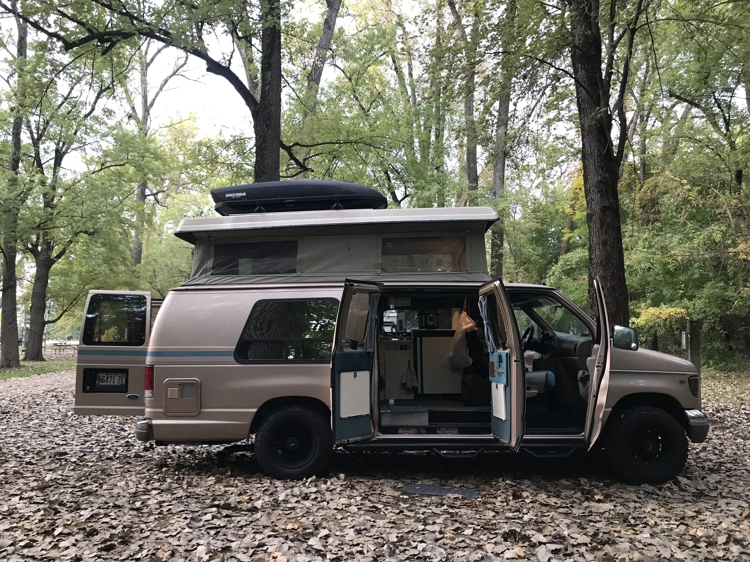 Equipped with heat, air conditioning, fridge, inverter, stove, water heater, and self-contained fresh water and gray-water tanks.